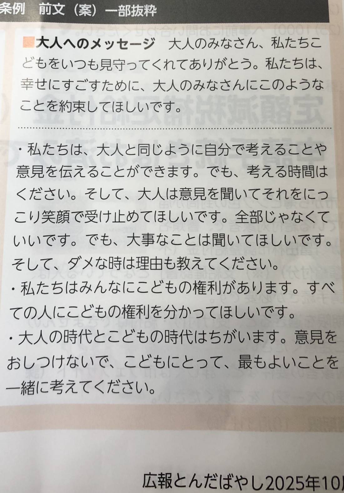 我が街は海老芋、茄子、きゅうりの大産地です。海老芋は少し高価かもしれませんが大変美味しい『ブランド里芋』で農林水産省の地理的表示GIに登録されています。『広報 とんだばやし10月号』に夏休み期間中の『こどもの権利条例一緒に作ってみない会』で、条例案を作った様です。